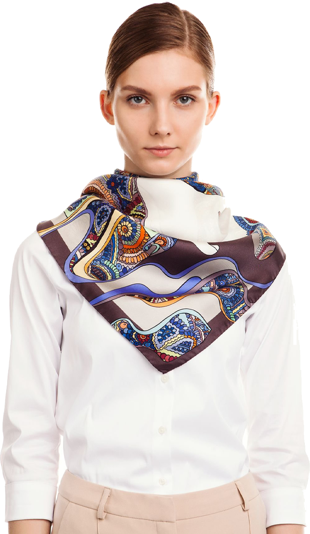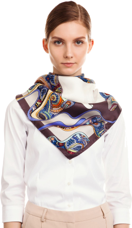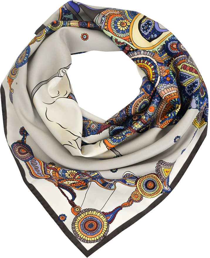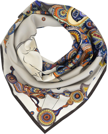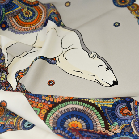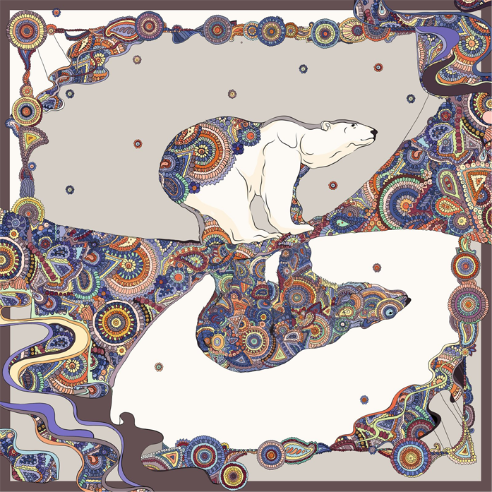 Это романтичное каре рассказывает о белых медведях и бескрайних снежных просторах. Мы задумались: а может быть в природе, когда мы не видим медведей, они совсем не белые, а изящной расцветки северного сияния? Эти элегантные цвета мы подсмотрели в путешествии по северу и перенесли их на шелк.