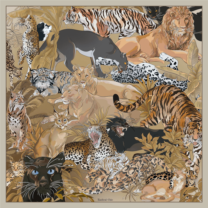 На этом платке собрались почти все представители семейства кошачьих — от величественного льва до редкого манула. Домашняя кошка (Felis catus) и тигр (Panthera tigris) имеют почти