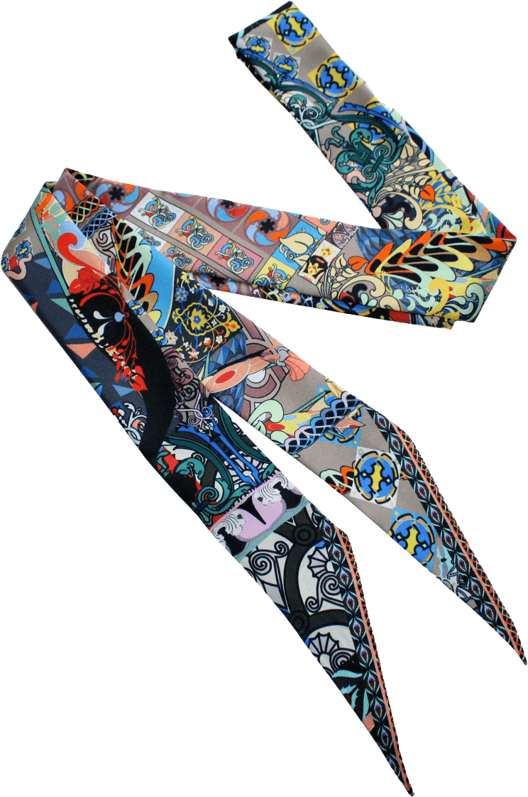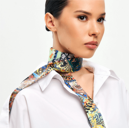 Шелковая галстучная лента, с которой можно придумать множество вариантов стилизации: классический бант или галстучный узел, свободные концы шарфа на спине. Можно продеть тонкий шелковый шарф в шлевки брюк как ремешок, обернуть им ручки сумки или украсить прическу.