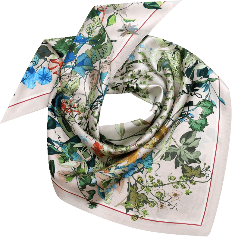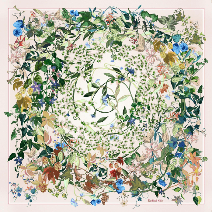 Он одновременно служит пряностью, антисептиком и объектом ботанической графики. В композиции платка спиральный рост лианы выглядит как естественная живая геометрия. Листья и побеги образуют круговое движение, основанное на биологических законах симметрии, повторе и движении к свету.