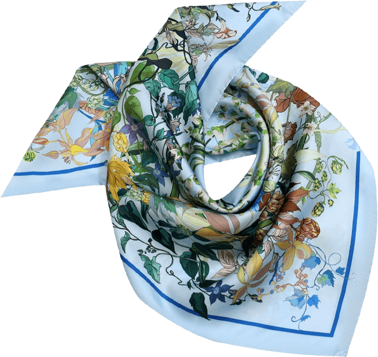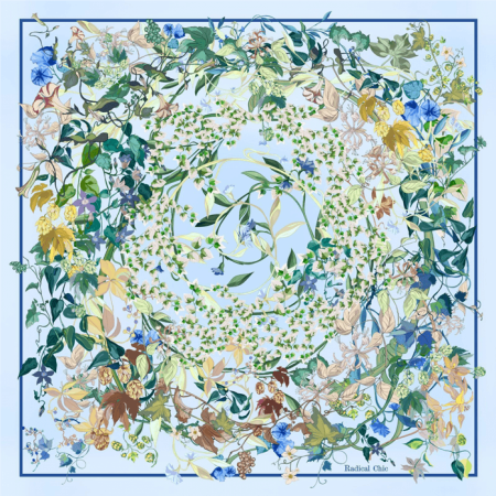 Он одновременно служит пряностью, антисептиком и объектом ботанической графики. В композиции платка спиральный рост лианы выглядит как естественная живая геометрия. Листья и побеги образуют круговое движение, основанное на биологических законах симметрии, повторе и движении к свету.