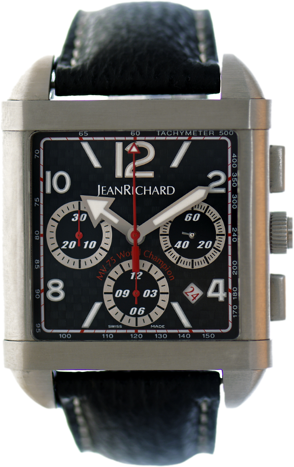 JEANRICHARD for MV Agusta – приверженность к точной механике сблизила производителей марки часов JEANRICHARD и производителей мотоциклов MV Agusta. MV Agusta является легендой в мире мотоциклов. Он побеждает в международных гонках на протяжении многих лет. МV Agusta производит тюнинговые мотоциклы «Brutale» на руле которого присутствует эмблема MV Agusta for JeanRichard. Соответственно часовая марка JEANRICHARD выпустила ограниченную серию часов JEANRICHARD for MV Agusta. Часы представляют собой хронограф, собранный на основе калибра JR1000. У часов JEANRICHARD MV Agusta прямоугольный корпус. Каждый экземпляр имеет индивидуальный номер. Корпус часов выполнен из стали, золота и титана. Купить часы JeanRichard MV Agusta очень сложно, в настоящее время эти часы успели стать коллекционным раритетом.