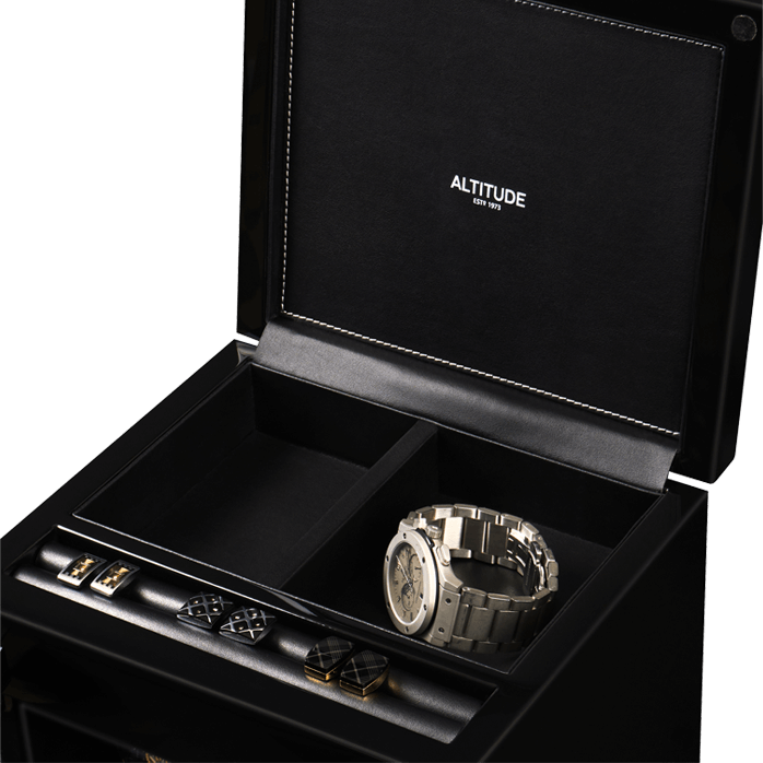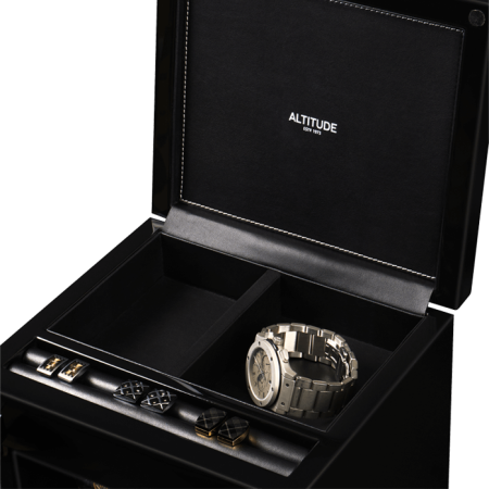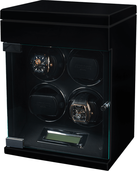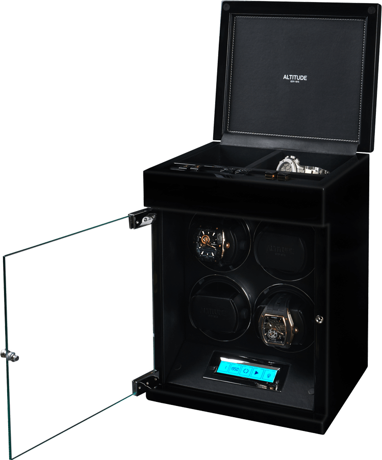 Немецкий производитель ALTITUDE представляет коллекцию — «Tradition», не оставляющую никого равнодушными. Шкатулки нового поколения «Tradition» выгодно выделяются за счет важных преимуществ: 1. Самые удобные телескопические держатели, идеально подходящие для любых наручных часов, вне зависимости от размеров и форм; 2. Надежная и простая фиксация держателей: вам не придется попадать в заданное отверстие, держатель зафиксируется в любом положении; 3. Функция «автостоп» — забудьте о проблеме вращения часов, при открытие дверцы: ротор автоматически остановится и включится повторно после закрытия. 4. Новые, абсолютно бесшумные моторы. Теперь даже при открытой дверце вы не услышите звук работающего мотора, подзаводящий ваши часы. Шкатулка изготавливается из благородного черного дерева “венге”, стекла и полированного металла. Деревянные элементы покрыты множественными слоями рояльного лака. Интерьер выполнен из эко-кожи черного цвета. В верхней части расположено дополнительное отделение, которое можно использовать для обычного хранения наручных часов небольшого размера и ювелирных украшений. Для удобства использования шкатулки в темное время суток, есть светодиодная подсветка. Основное предназначение шкатулки — автоматических независимый подзавод 4-х часов любой сложности. Выбор программ осуществляется при помощи сенсорного дисплея последнего поколения. Питание от сети 220 вольт. В комплекте адаптер, салфетка, держатели для часов. Инструкция на русском языке. Упакована в фирменную белую картонную коробку с ручкой. Важное преимущество коллекции «Tradition» — самые удобные телескопические держатели и бесшумная работа.