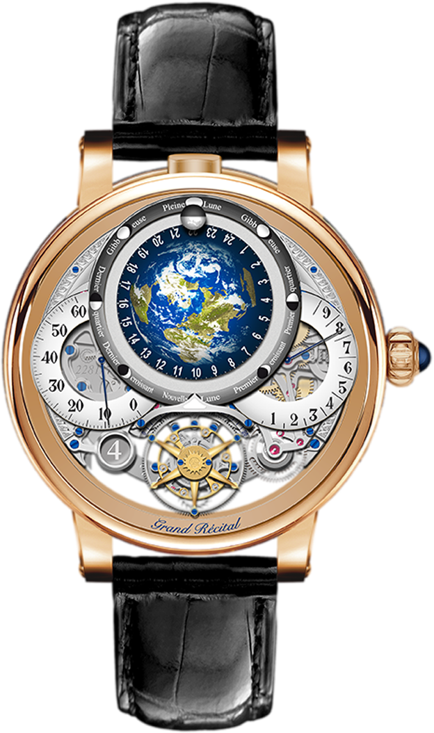 Эта кинетическая модель из трех небесных тел известна под названием Tellurium-Orrery. Парящий турбийон играет роль Солнца, а мост каретки напоминает его пылающие лучи. Элегантный полушарий Земли вращается вокруг собственной оси и указывает время следуя естветственному 24-часовому циклу. Луна сферической формы движется по орбите вокруг Земли и совершает полный оборот за 29,53 суток, в точности повторяя свой синодический период. Ретроградный указатель минут и указатель запаса хода гармонично вписываются в “космическую” эстетику: их куполообразная форма перекликается с изгибом земного шара. В центры секторов встроены лупы из сапфирового стекла, которые позволяют насладиться великолепием механизмов и визуально раздвигают границы заключенного в корпус пространства. Изобилующий инновациями и специально спроектированный для Grand Recital вечный календарь разместился на оборотной стороне часов. Все его функции управляются единственной кнопкой, расположенной над 12-ти часовой отметкой на корпусе. Часы будут доступны в корпусе из розового золота, платины или титана. Ограниченная серия из 60 механизмов.