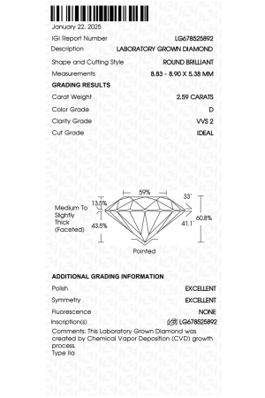 Лабораторно выращенные бриллианты – это бриллианты, которые производятся в контролируемых технологических процессах, в отличие от природных бриллиантов, которые создаются геологическими процессами и добываются горнодобывающим способом. В отличие от имитаций бриллианта, сделанных из внешне похожих небриллиантовых материалов, лабораторные бриллианты состоят из того же материала, что и природные бриллианты — чистого углерода, и имеют идентичные химические и физические свойства : кристаллическая структура, твердость – 10 по шкале Мооса, отражательность, теплопроводность, оптические свойства, плотность, показатель преломления и прочее.