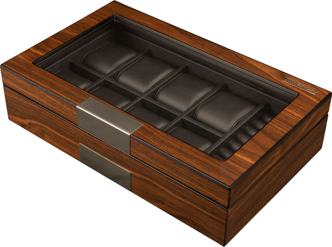 Для ценителей своих наручных аксессуаров мы расположили прозрачное стекло посередине крышки, через которое можно созерцать коллекцию из 8-ми часов и небольшого количества искусных ювелирных украшений. Исполнение экстерьера в дереве Бакаут является редкостью, а покрытие множественными слоями высококачественного матового лака придает изящность.