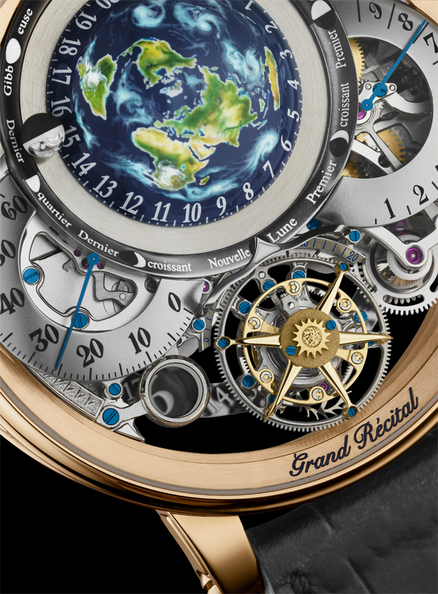 Эта кинетическая модель из трех небесных тел известна под названием Tellurium-Orrery. Парящий турбийон играет роль Солнца, а мост каретки напоминает его пылающие лучи. Элегантный полушарий Земли вращается вокруг собственной оси и указывает время следуя естветственному 24-часовому циклу. Луна сферической формы движется по орбите вокруг Земли и совершает полный оборот за 29,53 суток, в точности повторяя свой синодический период. Ретроградный указатель минут и указатель запаса хода гармонично вписываются в “космическую” эстетику: их куполообразная форма перекликается с изгибом земного шара. В центры секторов встроены лупы из сапфирового стекла, которые позволяют насладиться великолепием механизмов и визуально раздвигают границы заключенного в корпус пространства. Изобилующий инновациями и специально спроектированный для Grand Recital вечный календарь разместился на оборотной стороне часов. Все его функции управляются единственной кнопкой, расположенной над 12-ти часовой отметкой на корпусе. Часы будут доступны в корпусе из розового золота, платины или титана. Ограниченная серия из 60 механизмов.