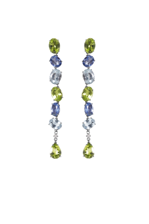 В коллекции представлены изысканные серьги, подвески и кольца, выполненные в двух цветовых гаммах: “теплой”, с красно-оранжевыми тонами в розовом золоте, и “холодной” с оттенками сине-зеленого, в белом золоте с родиевым чернением.