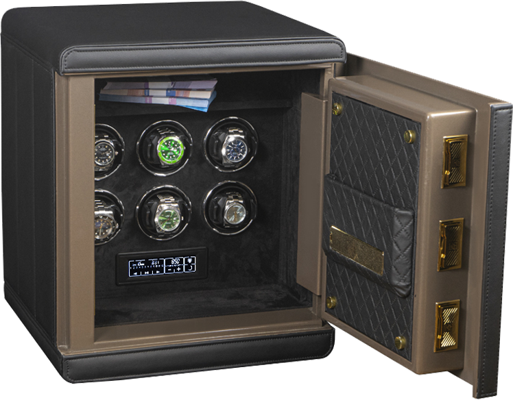 Для настоящих ценителей своих часов, внутри сейфа предусмотрен автоподзавод 6-ти часов, который включается всего с одной кнопки на сенсорной консоли. Профессиональная система выбора режимов вращения сможет завести любые часы любой сложности. Достаточно просто на сенсорном экране подобрать нужное количество оборотов (от 650 до 1950), выбрать подходящее вращение (по часовой / против часовой стрелки или попеременное вращение) и часы будут автоматически подзаводиться. Можно остановить вращение определенных часов в шкатулке для удобного извлечения их из ячейки.